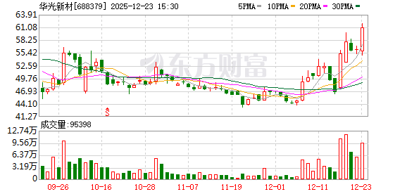 证券时报·数据宝统计显示,华光新材今日收盘价为61.00元,上涨8.44%,日换手率为10.59%,成交额为5.67亿元,全天主力资金净流入4120.17万元,近5日该股累计上涨30.54%,近5日资金合计净流入3703.90万元。