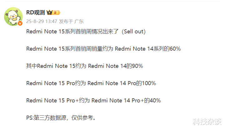 这不行业人士“RD观测”就在8月29日给出了REDMI Note 15系列首销周的数据,根据他提供的数据REDMI Note 15系列首销周的销量约为REDMI Note 14系列的60%,换言之REDMI Note 15系列这一代首销周销量是不如上一代的。其中REDMI Note 15约为REDMI Note 14的90%;REDMI Note 15 Pro约为REDMI 14 Pro的100%,REDMI Note 15 Pro+约为REDMI Note 14 Pro+的40%。简单来讲销量最好的是REDMI Note 15 Pro,销量第二好的是REDMI Note 15,REDMI Note 15 Pro+可能是没有达到官方预期的。这个销量真有点意外,这也可能是官方没有发战报的原因所在。