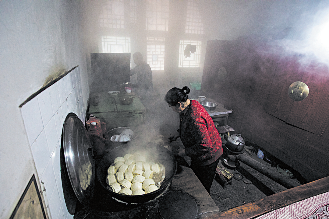2019年2月,佳县,窑洞内蒸馒头。